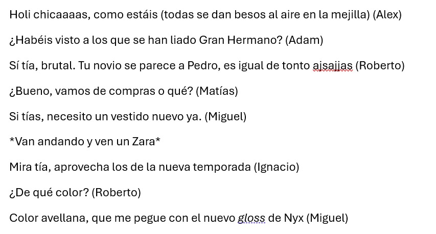 Para poder vivirlo de manera clara, el profesor nos indicó que nos juntáramos en grupos exclusivamente de hombres y mujeres respectivamente e hiciéramos un pequeño guion que deberíamos representar en clase en el que se pudieran observar de buena forma los generolectos y las cosas socialmente asociadas a cada género.